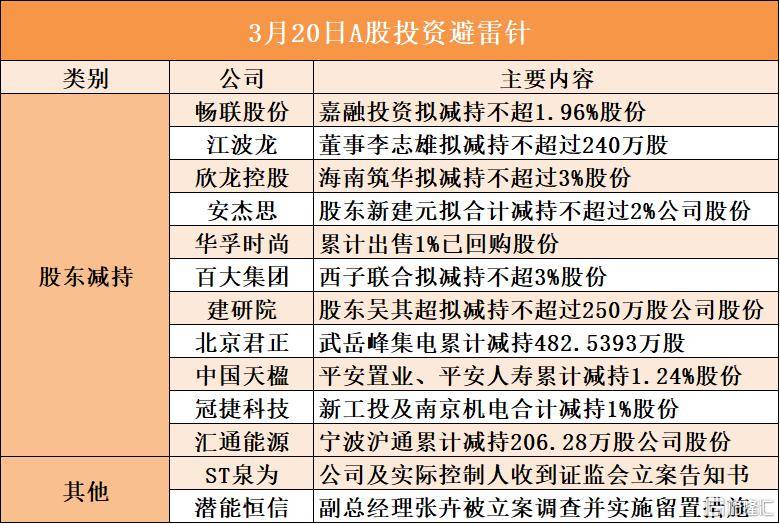 畅联股份股东嘉融投资拟减(jian)持不超1.96%股份;江波龙董(dong)事李志雄拟减(jian)持不超过240万(wan)股;欣龙控(kong)股股东海南筑华拟减(jian)持不超过3%股份;安杰思股东新建元拟合计减(jian)持不超过2%公司股份;百大集团股东西子联合拟减(jian)持不超3%股份;建研(yan)院(yuan)股东吴(wu)其超拟减(jian)持不超过250万(wan)股公司股份;汇通能源股东宁波沪通累计减(jian)持206.28万(wan)股公司股份 ;ST泉为公司及实际控(kong)制人收到证监会立(li)案告知书;潜能恒(heng)信副总经理张卉被立(li)案调查(cha)并实施留置措施