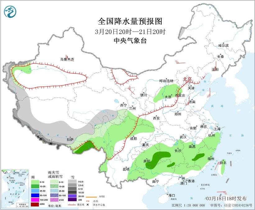 3月20日20时至21日20时,新疆(jiang)西部和(he)南部、西藏南部和(he)东北(bei)部、青海东南部等地部分(fen)地区有小到中雪或雨夹雪,其中,西藏南部局地有大到暴雪(10~19毫米(mi));福(fu)建西部、江西东部、湖南西南部、广西北(bei)部、贵州东南部、西藏东南部等地部分(fen)地区有中雨。甘(gan)肃河西、内蒙古中部、辽宁大部、山东、西藏南部、北(bei)疆(jiang)沿(yan)天山一带等地部分(fen)地区有4~6级风;渤海、东海南部、台湾海峡等海域有5~6级风、阵风7级(见图3)。
