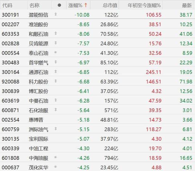 A股市场油气(qi)股集体下跌,个(ge)中,潜能(neng)恒信跌超10%,准油股份、和顺石油跌超8%,贝肯能(neng)源、泰(tai)山石油跌超7%,首(shou)华(hua)燃气(qi)、通源石油、科力股份、博汇(hui)股份、中曼石油跌超6%,石化(hua)油服、惠博普、洲际油气(qi)、宝利国际跌超5%。消息面上,国际油价回(hui)调,布伦特原(yuan)油昨日一度冲高至112美圆后回(hui)调,收报103.07美圆,今日继续下跌,盘(pan)中一度跌至100.47美圆。